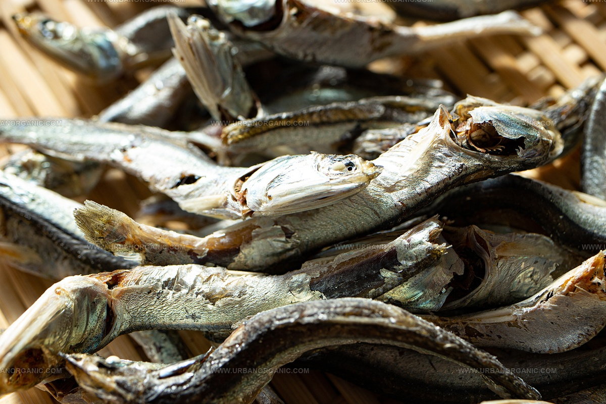 Sardines transform into dark brown, crispy morsels during the drying process, creating a potent ingredient for broths and seasoning.