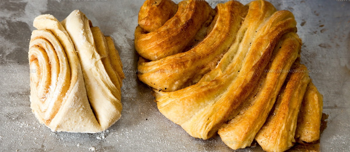 Bakers carefully roll the dough into a delicate, light sheet before baking and wrapping it around creamy fillings.