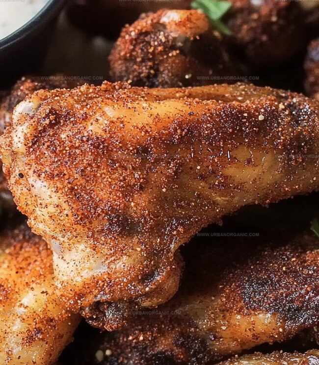 The dry rub combines multiple spices like paprika, garlic powder, chili powder, and brown sugar, creating a complex flavor profile that adds depth and subtle sweetness to the chicken wings.