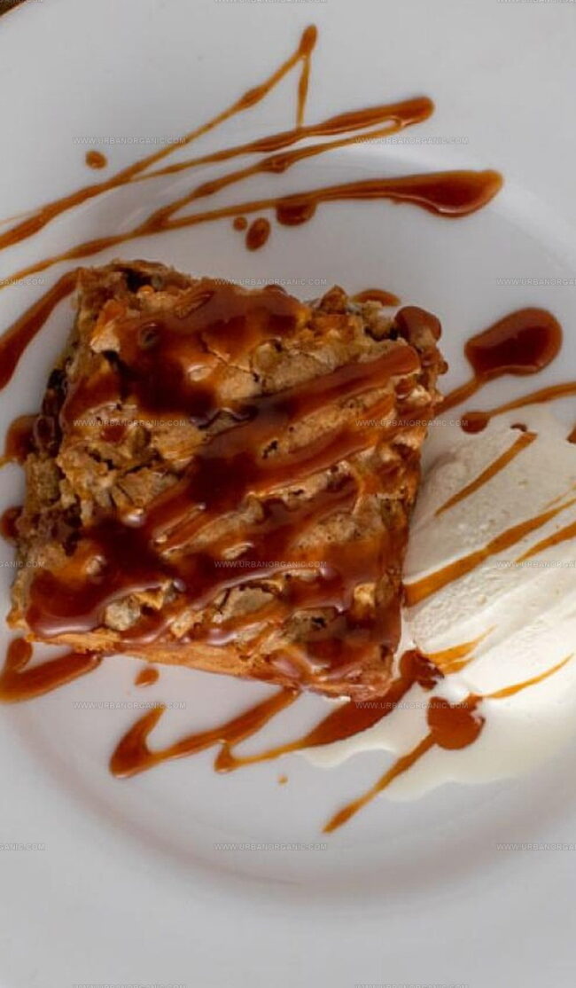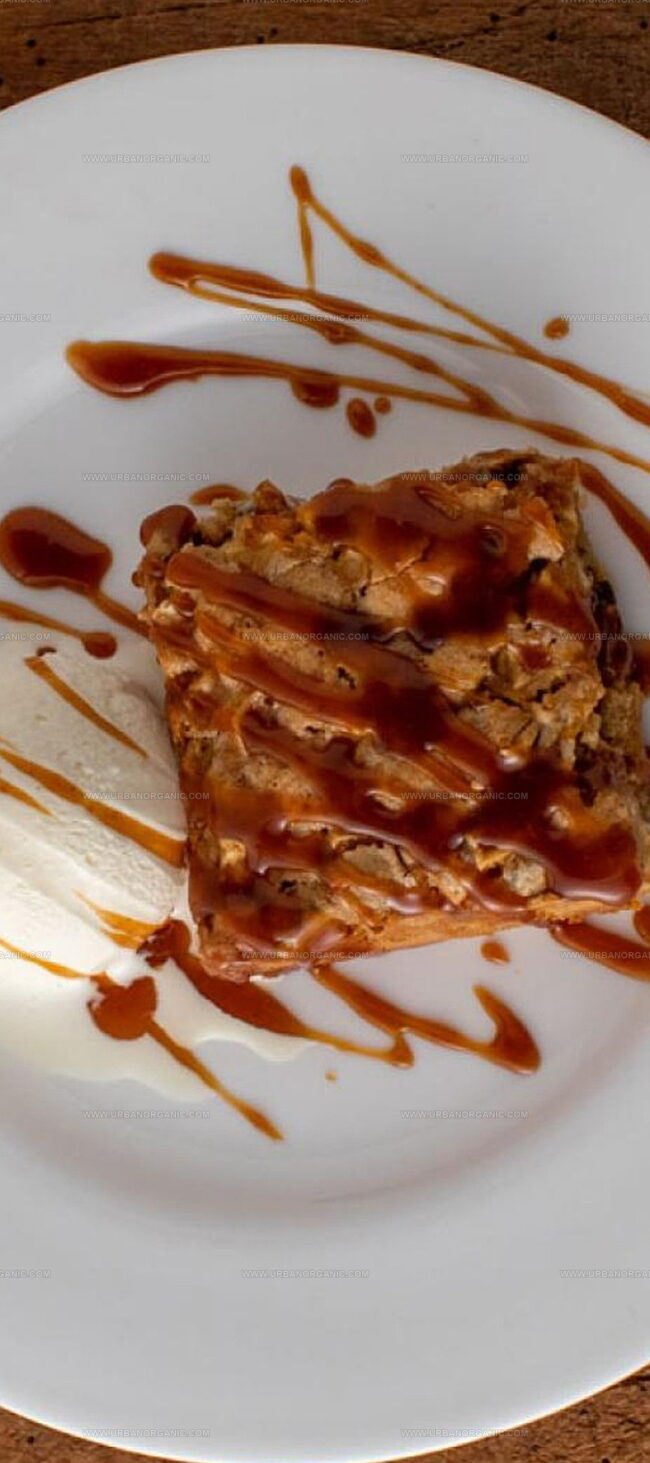Let the cake cool slightly, then slice into squares. Crown each piece with a scoop of vanilla ice cream and a caramel waterfall for the ultimate indulgence.
