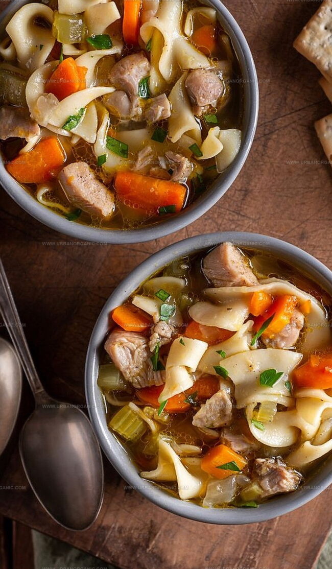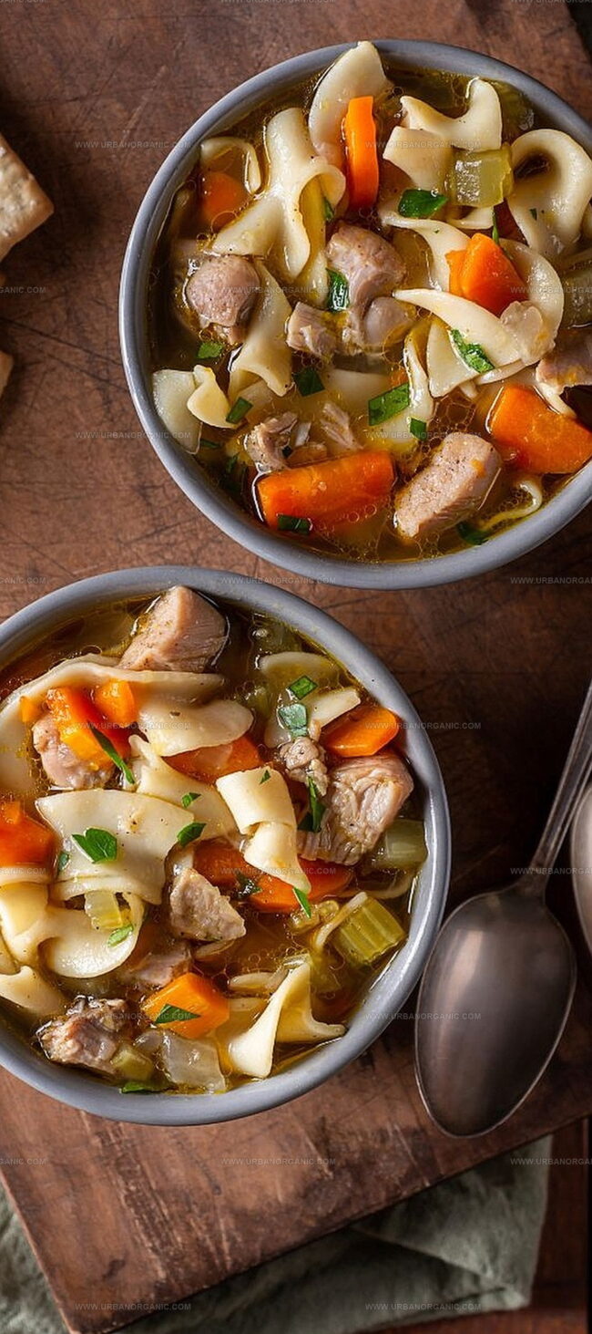 This hearty chicken noodle soup transforms ordinary ingredients into a soul-warming embrace on frosty evenings.