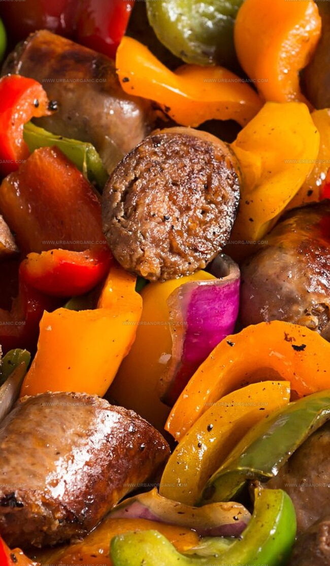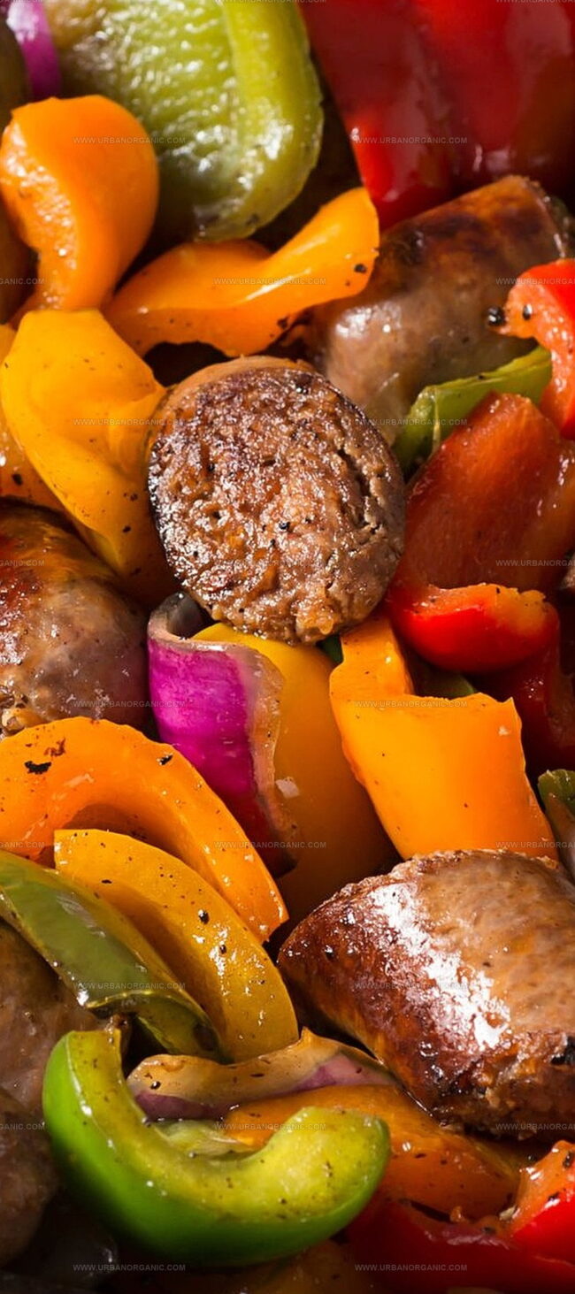 Succulent links sizzle alongside rainbow-hued bell peppers, creating a sensory explosion of flavor.