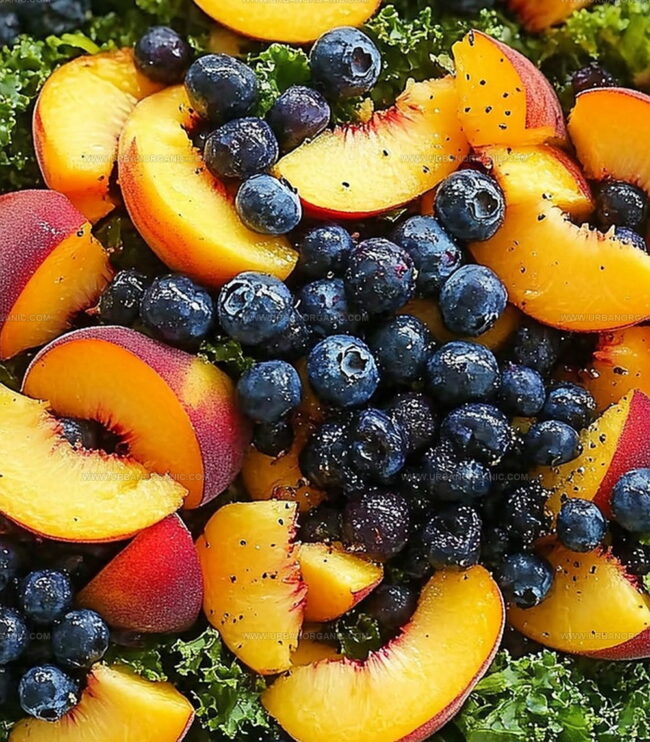 - Transfer massaged kale into a spacious serving vessel, then artfully arrange juicy peach slices, plump blueberries, thinly sliced crimson onion, and crunchy almond slivers across the leafy base.